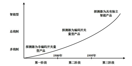 ? ? 第一階段產(chǎn)品為多線制火災(zāi)探測報(bào)警系統(tǒng),探測器為非編碼開關(guān)量型產(chǎn)品。每個(gè)探測器除需提供兩根電源線外,還需要提供一根報(bào)警信號線。目前國內(nèi)除極少數(shù)廠家仍在生產(chǎn)外,該產(chǎn)品基本上已處于被淘汰狀態(tài)。