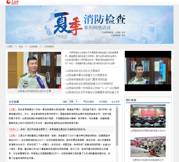 近日,王勇總隊長就我省夏季消防檢查工作接受了人民網訪談。此次訪談是全國“夏季消防檢查系列訪談”專欄的第一期,由部消防局和人民網聯(lián)合策劃主辦,并在人民網首頁、人民網法制頻道首頁、人民消防網首頁等網站進行全程直播。