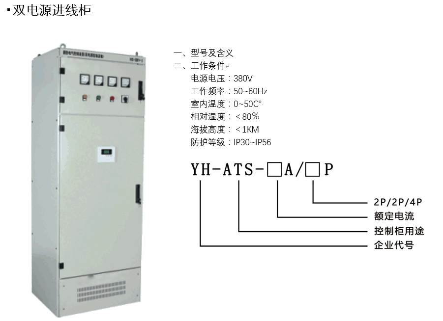 YH-ATS控制柜內(nèi)雙電源自動(dòng)切換裝置主要由電源轉(zhuǎn)換執(zhí)行斷路器(包括常用電源執(zhí)行斷路器QN和備用電源執(zhí)行斷路器QR各一臺(tái)),電動(dòng)操作機(jī)構(gòu)等部分組成。斷路器QN和QR均保持原有的過(guò)載保護(hù)和適中保護(hù)功能,可同時(shí)作為通、斷及保護(hù)電源之用。有電源失壓、過(guò)壓、欠壓、斷相、斷路保護(hù)功能,雙路電源的自動(dòng)轉(zhuǎn)換(可以設(shè)置為手動(dòng)、自動(dòng)),設(shè)備內(nèi)預(yù)留遠(yuǎn)程控制功能。